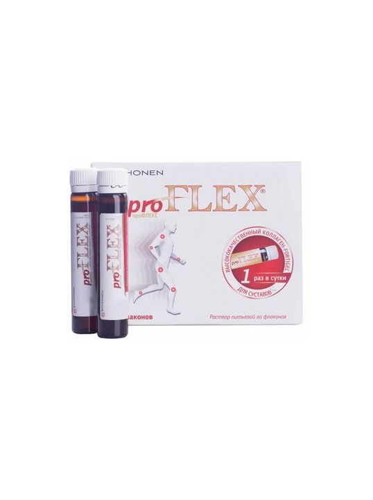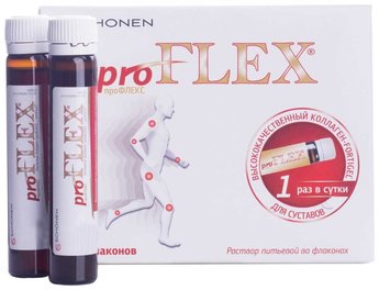 1 флакон проФЛЕКС / proFLEX® содержит: гидролизат коллагена FORTIGEL® – 10,0 г, кислота аскорбиновая (витамин C) (E300) – 60,0 мг; вспомогательные вещества: вода очищенная, фруктоза, регулятор кислотности кислота лимонная (Е330), краситель солодовый экстракт, ароматизатор апельсиновый, консервант сорбат калия (Е202), подсластитель цикламат натрия (Е952), подсластитель ацесульфам калия (Е950), подсластитель сукралоза (Е955), стабилизатор кирнол (E471).