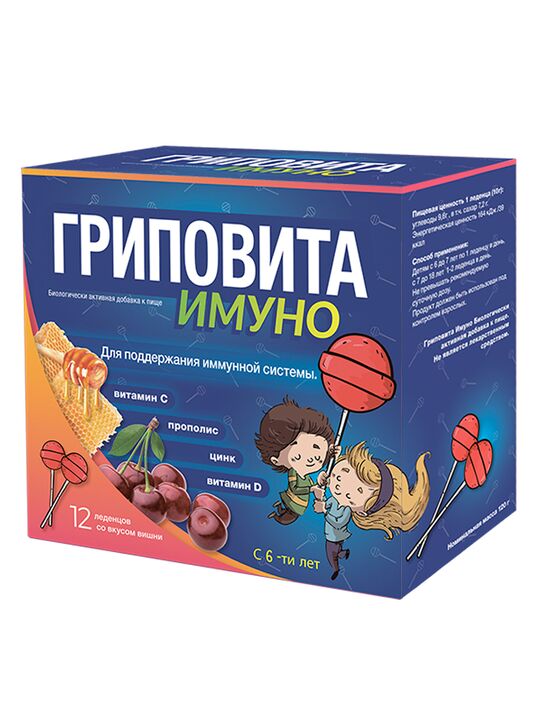 Гриповита Имуно 12 леденцов в индивидуальных упаковках со вкусом вишни для поддержания иммунной системы.