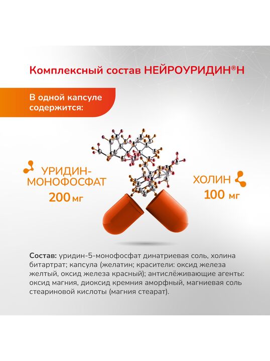 DL-холина битартрат, уридин-5-монофосфат, желатин, микрокристаллическая целлюлоза (носитель), витамин В6 (пиридоксина гидрохлорид), магниевые соли стеариновой кислоты (антислеживающий агент), витамин В1 (тиамина гидрохлорид), кремния диоксид (антислеживающий агент), титана диоксид (краситель), фолиевая кислота, витамин В12 (цианокобаламин), железа оксид желтый (краситель), железа оксид красный (краситель).