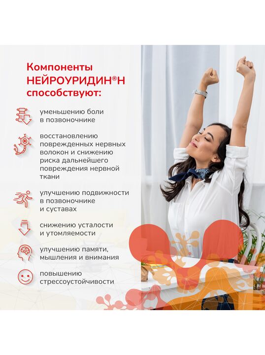 Нейроуридин - специально подобранная комбинация нейротропных веществ: витаминов группы В (В1, В6, В9, В12), нуклеотида (уридинмонофосфат) и холина, необходимых для восстановления нервных волокон, улучшения нервной проводимости, укрепления нервной системы и общего состояния организма.