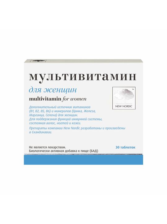 В составе препарата Мультивитамин для женщин от компании Нью Нордик идеально сбалансированное сочетание хорошо усваиваемых витаминов и минералов, которые не только обеспечивают женскую красоту, бодрость, отличное самочувствие и способствуют сохранению здоровья, но и поддерживают при физических нагрузках. Как результат - сияющая кожа, блестящие волосы, заряд энергии на целый день и здоровая иммунная система.