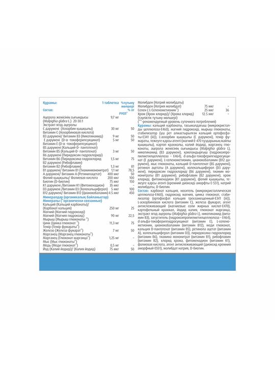 Витамин D 5 мкг, Молибден 75 мг, Витамин Е 5 мг, Железо 7 мг, Витамин К 35 мкг, Фолиевая кислота 200 мкг, Пантотеновая кислота 3 мг.