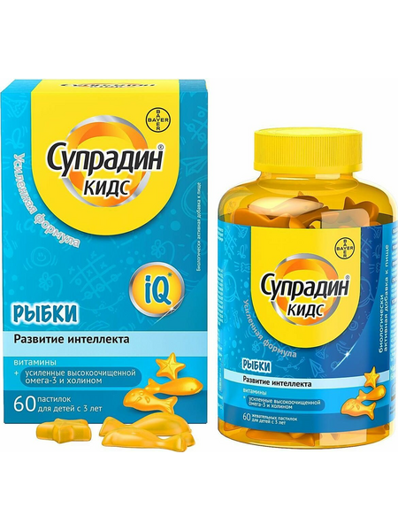 Супрадин Кидс Рыбки способствует повышению уровня IQ ребенка за счет усиленного содержания омеги-3 и холина — строительных материалов клеток головного мозга.