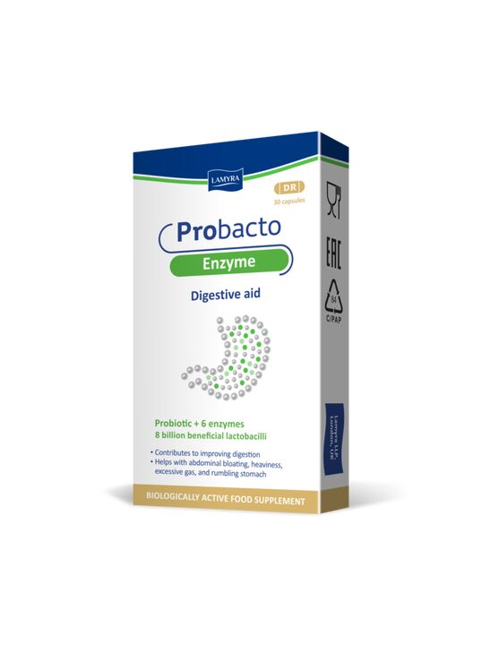 Пробиотическая добавка Пробакто Энзим применяется при нарушениях пищеварения, в том числе при диареях различного генеза и недостаточности ферментов. В состав пробиотика Пробакто Энзим входит комплекс ферментов (амилаза, липаза, папаин, бромелайн, лактаза, галактозидаза) и 3 штамма лактобактерий. Лактобактерии L.Acidophilus, L.Casei, L.Rhamnosus являются наиболее изученными с позиций доказательной медицины и показали в клинических исследованиях пользу для здоровья человека. Лактобактерии являются частью нормальной микрофлоры человека, конкурируют за среду обитания и снижают численность патогенной микрофлоры полости рта, дыхательных путей и кишечника, продуцируют Jg A, активируют местный иммунитет, нормализуют сон и повышают устойчивость к стрессу и инфекциям.