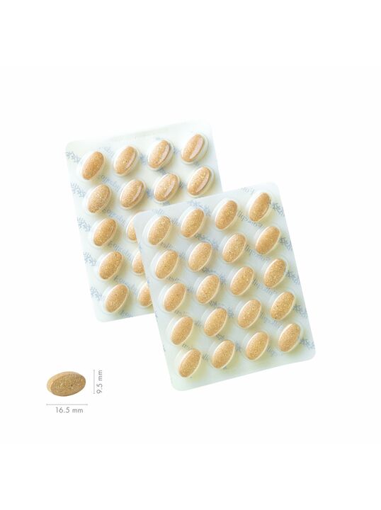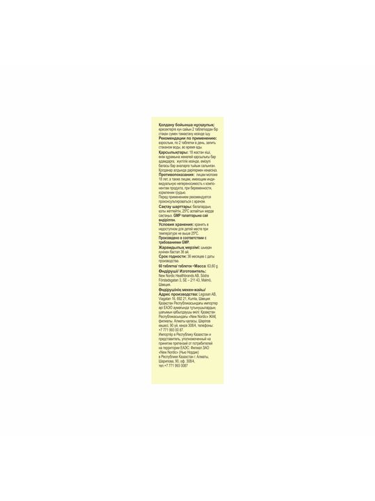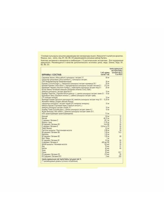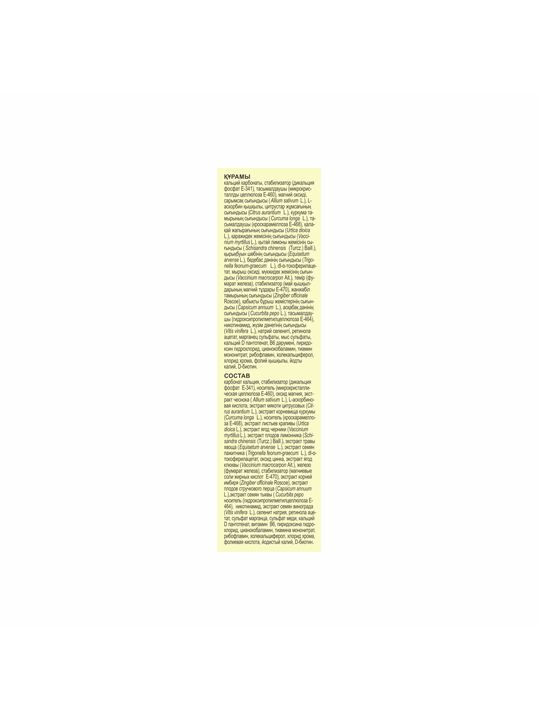 Экстракт чеснока (Allium sativum L.) 3:1 100 мг. Экстракт плодов померанца (Citrus aurantium L.) (35% биофлавоноидов) 60 мг. Куркума (Curcuma longa L.) экстракт корня 30:1 50 мг . Экстракт листья крапивы (Urtica dioica L.) 5:1 43 мг. Экстракт ягод черники (Vaccinium myrtillus L.) 5:1 40 мг. Лимонник китайский (Schisandra chinensis (Turcz.) Bail.) экстракт плодов 5:1 30 мг. Пажитник сенной (Trigonella foenum-graecum L.) экстракт семян 5:1 30 мг. Хвощ полевой (Equisetum arvense L.) экстракт травы (7% кремния) 30 мг. Крупноплодная клюква (Vaccinium macrocarpon Aiton) экстракт ягод 15:1 4,5 мг. Имбирь обычный (Zingiber officinale Roscoe) экстракт корня (5% имбирь) 20 мг. Экстракт плодов паприки (Capsicum annuum L.) 4:1 20 мг. Экстракт семян тыквы (Cucurbita pepo L.) 4:1 20 мг. Экстракт семян винограда (Vitis vinifera L.) (40% процианидины) 25:1 15 мг. Кальций (карбонат кальцию) 236 мг. Магний (оксид магнию) 97,44 мг. Витамин С (L-аскорбиновая кислота) 90,2 мг. Цинк (оксид цинка) 22,5 мг. Витамин B3 (никотинамид) 18 мг. Витамин Е (D-альфа-сукцинат токофериловой кислоты) 10,08 мг. Железо (фумарат железа) 7 мг . Пантотеновая кислота (D-пантотенат кальцию) 6 мг. Витамин B6 (пиридоксин гидрохлорид) 3 мг. Марганец (сульфат марганца) 2,5 мг. Витамин B2 (рибофлавин) 2,1 мг. Медь (сульфат меди) 2000 мкг . Витамин B1 (тиамин мононитрат) 1,8 мг. Витамин А (ретинилацетат) 800 мкг. Фолиевая кислота (птероилмоноглутаминова кислота) 200 мкг. Йод (йодид калия) 152 мкг. Биотин (D-биотин) 80 мкг. Хром (хлорид хрому (III)) 50 мкг. Селен (селенит натрия) 50 мкг. Витамин D3 (холекальциферол) 5 мкг. Витамин B12 (цианокобаламин) 4 мкг.