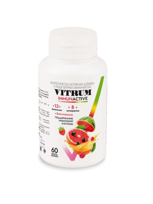 Витаминно-минеральный комплекс ВИТРУМ ИММУНАКТИВ VITRUM IMMUNACTIVE содержит 13 витаминов и 8 минералов, а также бета-глюканы и биофлаваноидный комплекс – необходимые компоненты, которые синергично работают для поддержки иммунитета: