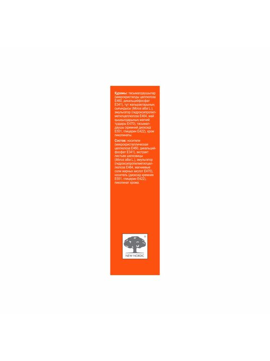 носители (микрокристаллическая целлюлоза Е460, дикальцийфосфат Е341), экстракт листьев шелковицы (Morus alba L.), эмульгатор (гидроксипропилметилцеллюлоза Е464, магниевые соли жирных кислот Е470), носитель (диоксид кремния Е551, глицерин Е422), пиколинат хрома.