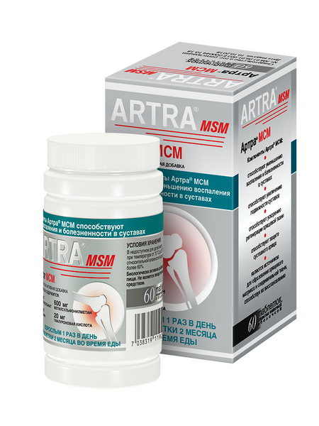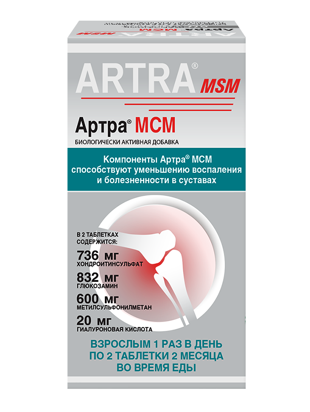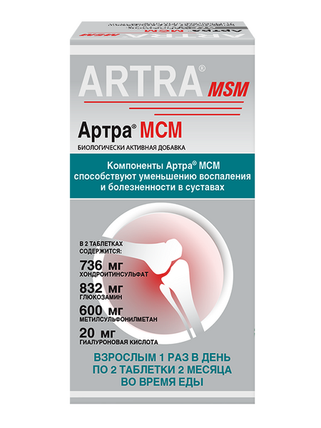 Область применения: в качестве биологически активной добавки к пище – источника глюкозамина, хондроитинсульфата, гиалуроновой кислоты, содержит метилсульфонилметан (МСМ 600 мг в 2-х таблетках). Компоненты Артра® МСМ являются источником для образования хрящевого матрикса и соединительной ткани, способствуя их восстановлению.