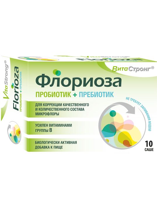 ВИТАСТРОНГ ФЛОРИОЗА применяется в качестве средства восстановления кишечной микрофлоры (нормализация ее качественного и количественного состава) и укрепления естественных защитных сил организма, при хронических заболеваниях желудочно-кишечного тракта, во время и после применения антибиотиков (в том числе эрадикационной терапии Helicobacter pylori), а также в качестве средства профилактики кишечных расстройств во время путешествий, во время вспышки кишечных инфекций.