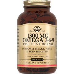 Капсулы «Комплекс жирных кислот 1300 мг Омега 3-6-9» рекомендуются в качестве биологически активной добавки к пище - дополнительного источника полиненасыщенных жирных кислот (ПНЖК), в том числе ПНЖК омега 3 (эйкозапентаеновой, докозагексаеновой альфа-линоленовой кислот), ПНЖК омега-6 (линолевой,...